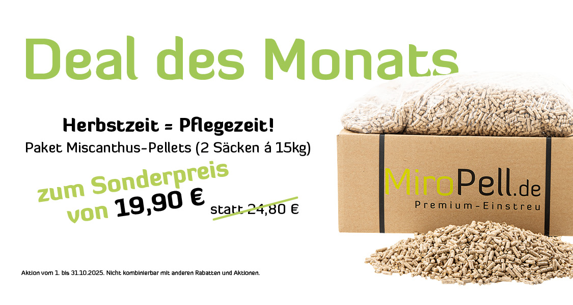 Mit unseren Pellets aus Miscanthus liefern wir Ihnen eine saugstarke, geruchsarme, pH-neutrale und kuschelige Einstreu-Alternative. MiroPell erleichtert Ihnen die Stallarbeit, trägt aufgrund seiner Eigenschaften zur Gesundheit Ihres Tieres bei und lässt sich durch die pH-Neutralität einfach entsorgen.